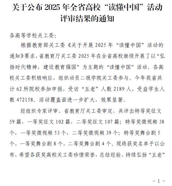 近日,河南省教育厅关工委下发了《关于公布2025年全省高校“读懂中国”活动评审结果的通知》(豫教关〔2025〕24号),公布了2025年全省高校“读懂中国”活动评审结果。我校在此次活动中表现良好,共斩获微视频类特等奖1项、二等奖2项,征文类二等奖4项,展现了学校在关心下一代工作方面的扎实成果。